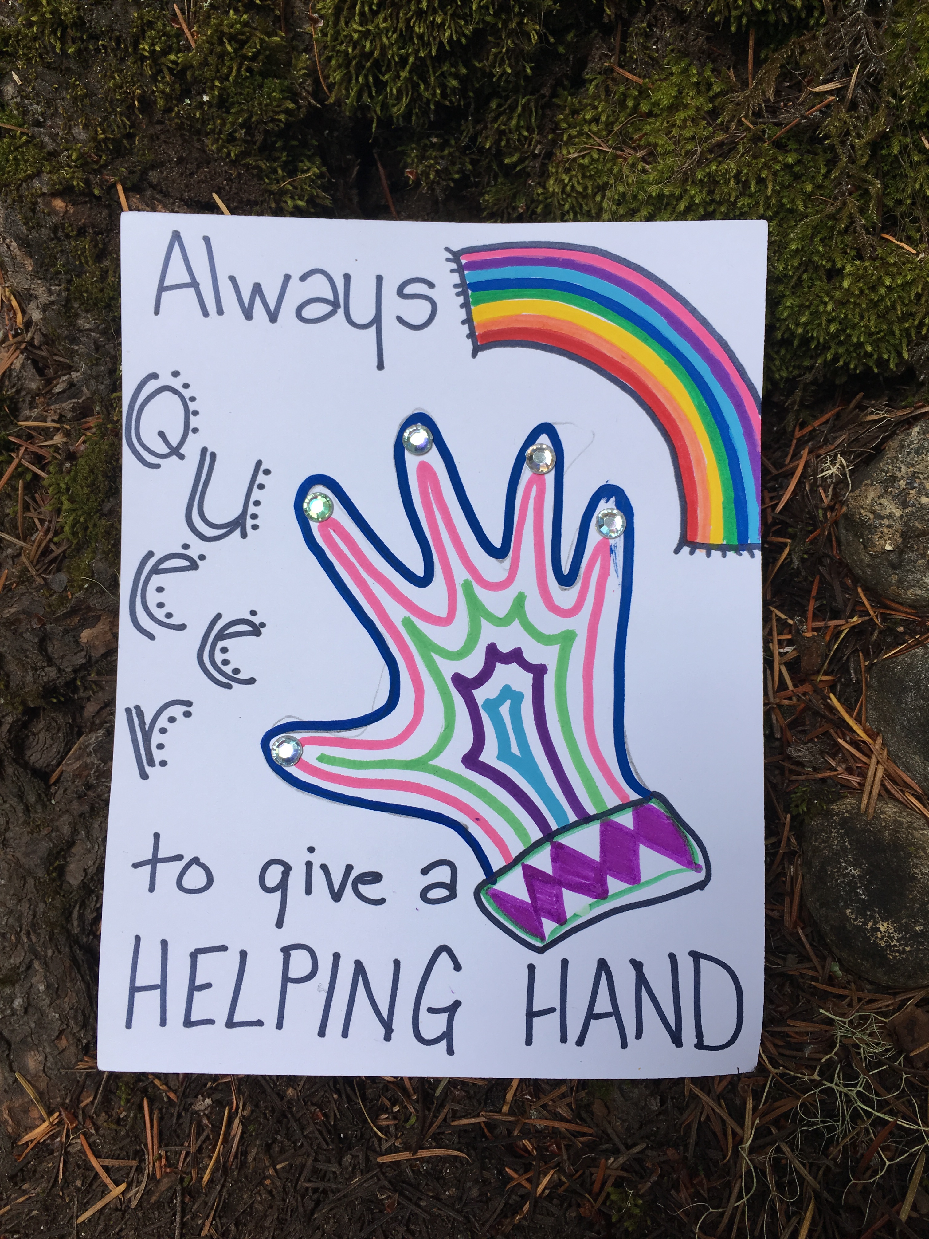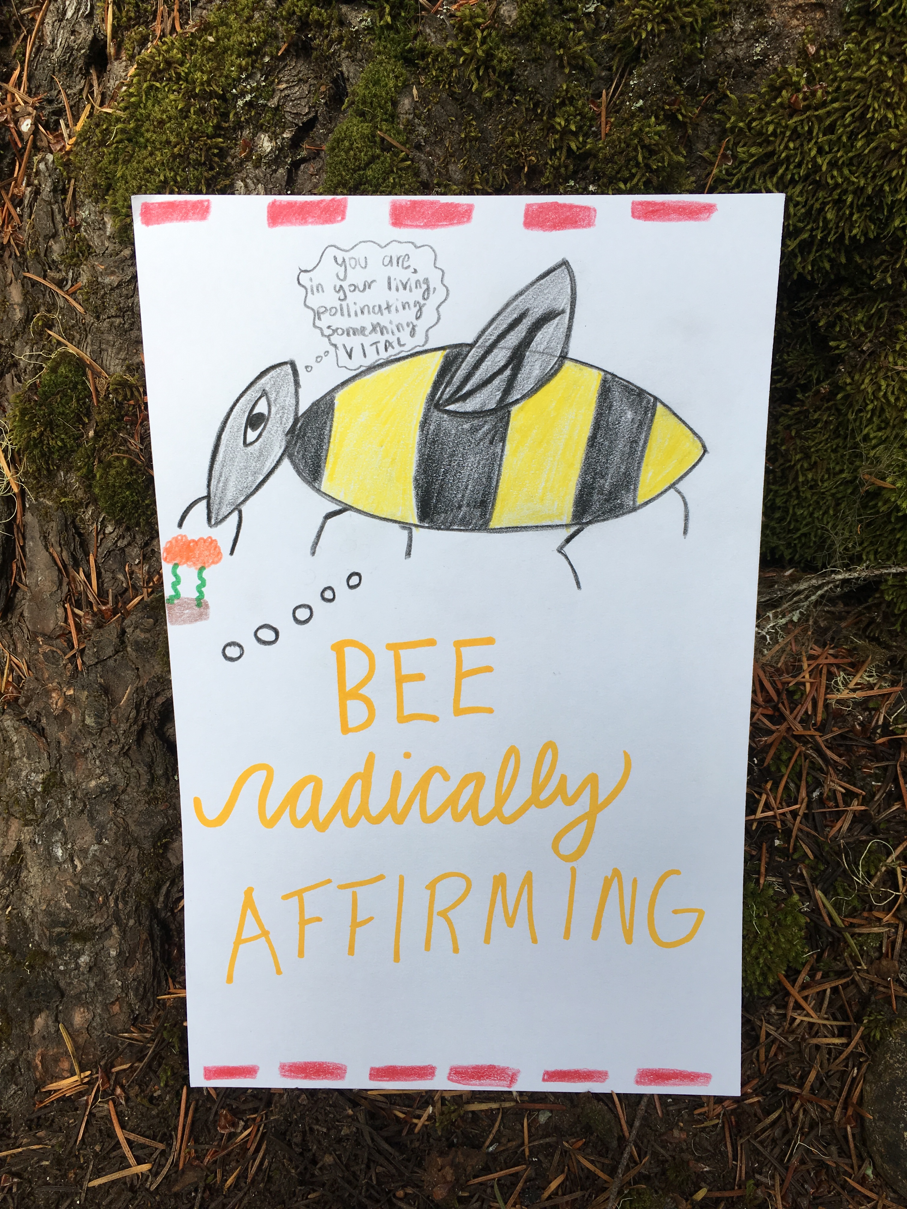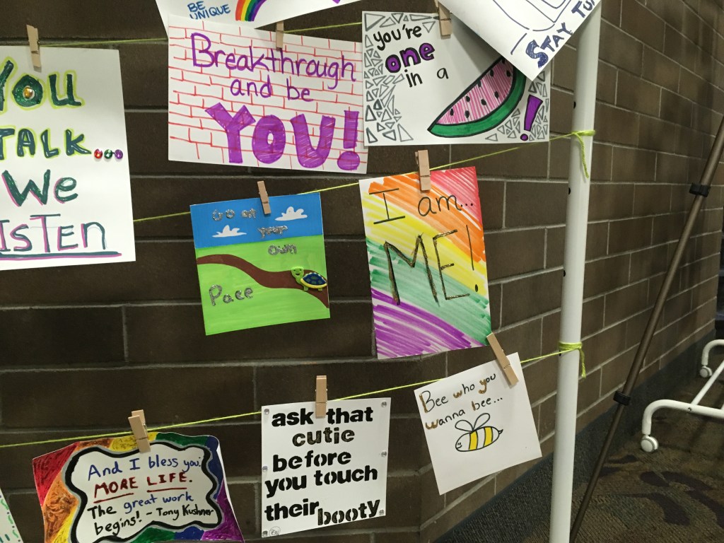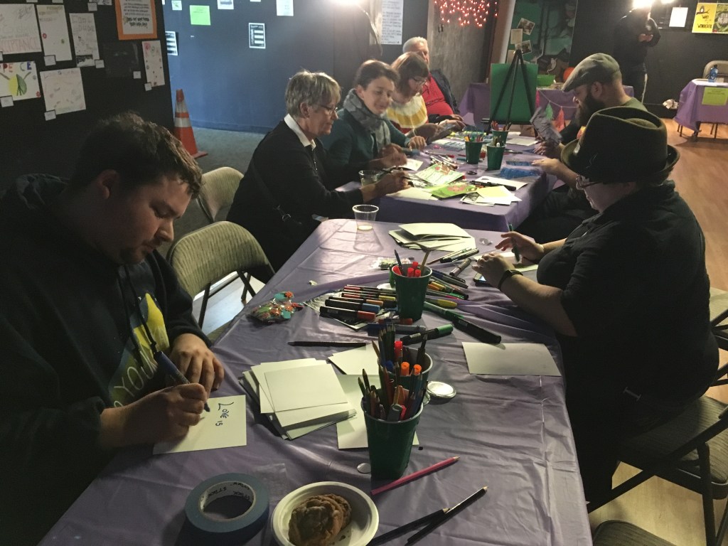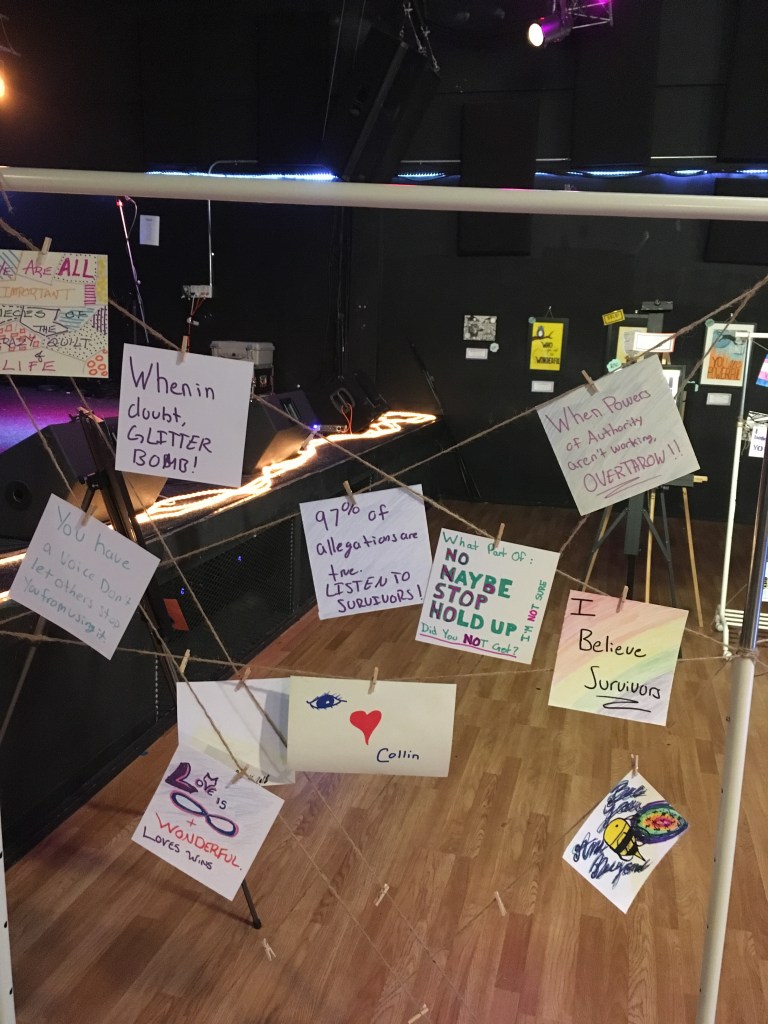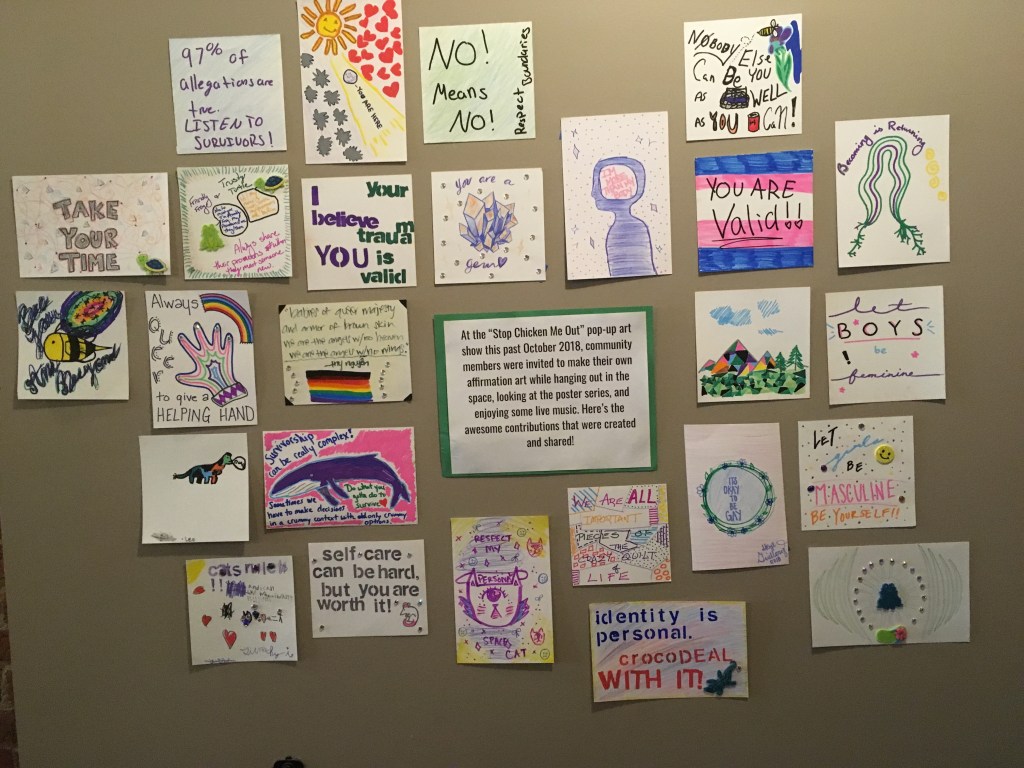 Affirmation Postcard Project: Folks continued to contribute postcards to “Chicken” through art shows and workshops throughout 2019, expanding Collin’s original series into so many more beautiful sentiments and works of art. In total, over 150 postcards were contributed to this project in about a year’s time. Collin brought them to their final stop in August 2019, decorating the walls of Camp Ten Trees’ dining hall, a queer youth summer camp in WA State, with affirming messages. The photos above show these postcards just before they were shown for the last time, many finding new homes with campers before they left.